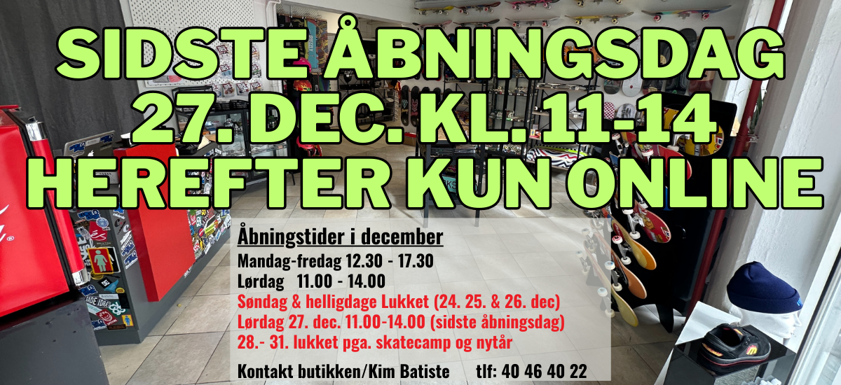 Du er kommet til en specialiseret skateboard butik, som også huser en fysisk butik i Kolding midtby. Vi ønsker at sælge kvalitetsprodukter til alle skatere uanset niveau lige fra nybegynder skateboards til custom made boards. Udover en udstyrsbutik, er vi også en vidensbank, event afvikler, kulturskaber og har til mål at bidrage til skateboard fællesskabet i Danmark gennem bl.a. skateboard camps, video projekter, skateboard konkurrencer, ungdomsklub og meget mere...